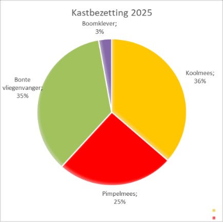 De verdeling van de legsels was: 78 Koolmezen (38%), 76 Bonte Vliegenvangers (37%), 54 Pimpelmezen (26%), 6 Boomklevers (3%) en 1 Gekraagde Roodstaart. Er was een aanmerkelijke stijging bij de Boomklevers en voortzetting van de daling bij de Pimpelmezen. Leuk was een eerste nestje van Gekraagde Roodstaarten wat 7 jongen opleverde.